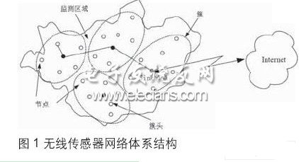 在無線傳感器網(wǎng)絡(luò)中,節(jié)點(diǎn)任意散落在被監(jiān)測區(qū)域內(nèi)。節(jié)點(diǎn)以自組織形式構(gòu)成網(wǎng)絡(luò),通過多跳中繼方式將監(jiān)測數(shù)據(jù)傳到Sink節(jié)點(diǎn),最終借助長距離或臨時(shí)建立的Sink鏈路將整個(gè)區(qū)域內(nèi)的數(shù)據(jù)傳送到遠(yuǎn)程中心進(jìn)行集中處理。圖1給出了一般形式的無線傳感器網(wǎng)絡(luò)體系結(jié)構(gòu)[3]。