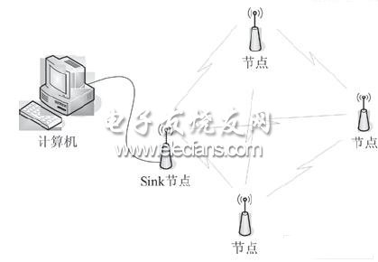 針對環(huán)境及結(jié)構(gòu)狀態(tài)監(jiān)測,我們設(shè)計(jì)了一種通用無線傳感器網(wǎng)絡(luò)硬件平臺,該硬件平臺由若干傳感器節(jié)點(diǎn)、具有無線接收功能的Sink節(jié)點(diǎn)及一臺計(jì)算機(jī)構(gòu)成。無線傳感器節(jié)點(diǎn)分布于需要監(jiān)測的區(qū)域內(nèi),執(zhí)行數(shù)據(jù)采集、處理和無線通信等工作,Sink節(jié)點(diǎn)接收各傳感器的數(shù)據(jù)并以有線的方式將數(shù)據(jù)傳送給計(jì)算機(jī),如圖2所示。