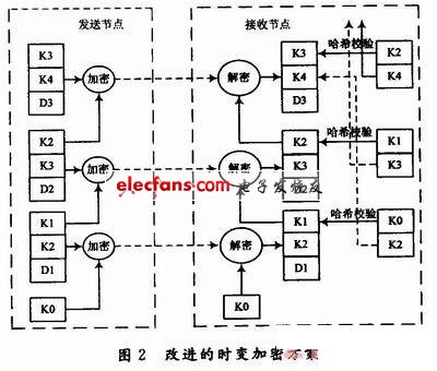 通過研究,知道節(jié)點間傳輸數(shù)據(jù)包的數(shù)據(jù)分為2部分,一部分為業(yè)務(wù)數(shù)據(jù),一部分為密鑰數(shù)據(jù)。業(yè)務(wù)數(shù)據(jù)傳輸中出現(xiàn)一次錯誤,可以放棄這一數(shù)據(jù),不會影響傳輸節(jié)點的工作,但是如果密鑰數(shù)據(jù)出現(xiàn)錯誤,節(jié)點就會失去下一次解密的密鑰,結(jié)點就會與整個網(wǎng)絡(luò)失去聯(lián)系。因此可以在傳輸數(shù)據(jù)包中,通過增加再后一次解密的密鑰Ki+1字節(jié),使接收節(jié)點在開始數(shù)據(jù)傳輸后始終保證擁有本次解密的K值和下一次解密的Ki+1值,當(dāng)本次數(shù)據(jù)傳輸發(fā)送錯誤后,可以丟棄本次數(shù)據(jù)包,等待下一數(shù)據(jù)包成功收到后直接使用密鑰Ki+1進行解密,減少一次數(shù)據(jù)包錯誤造成節(jié)點失去和源節(jié)點聯(lián)系的可能性,降低節(jié)點對單一密鑰的依賴,改進的編碼原理如圖2所示。