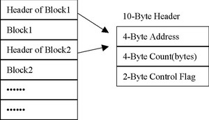 對(duì)任何一種模式,引導(dǎo)程序會(huì)根據(jù)模式引腳選擇的外部程序存儲(chǔ)器的類型,先讀出一個(gè)10個(gè)字節(jié)的文件頭(Header)。文件頭由4個(gè)字節(jié)的目的地址、4個(gè)字節(jié)的傳輸數(shù)據(jù)數(shù)量(字節(jié)數(shù))和2個(gè)字節(jié)的控制標(biāo)志組成。如果用戶程序或數(shù)據(jù)需要放在DSP內(nèi)存的不同地址塊,可以采用分塊引導(dǎo)的方式來(lái)進(jìn)行數(shù)據(jù)加載,每個(gè)塊(Block)用不同的文件頭描述。一旦所有的塊裝載完畢,處理器將結(jié)束引導(dǎo)進(jìn)程,并從L1指令存儲(chǔ)器的起始地址(0xFFA00000)開(kāi)始執(zhí)行放在這里的用戶代碼。文件頭中控制標(biāo)志描述了塊的一些屬性。圖4是引導(dǎo)時(shí)的數(shù)據(jù)流和文件頭格式。