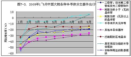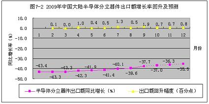 2009年1~9月份,中國大陸半導體分立器件出口額增長率從元月份的-43.4%,回升到9月份的-37.7%。只回升了5.7個百分點。按此回升速度計算,到今年年底,只能回升到-35.5%,預計2010年會有所好轉(zhuǎn)(見圖7-2)。
