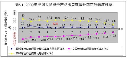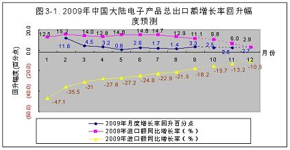 2008年下半年,國際金融風暴席卷全球,以出口為主導的中國大陸電子信息產(chǎn)業(yè)直接受到?jīng)_擊,產(chǎn)品進出口受阻,導致產(chǎn)品產(chǎn)量不斷下降,到今年元月份下降到谷底。由于中國政府及時實行積極的財政政策,調(diào)整產(chǎn)品結(jié)構(gòu),努力擴大內(nèi)需,電子信息產(chǎn)業(yè)從2月份開始逐漸回升。雖然在個別月份有所波動,但回升趨勢穩(wěn)定向好。預計2009年全行業(yè)能實現(xiàn)5%左右的增長;進出口額雖然有較大幅度的回升,但仍將呈現(xiàn)負增長;由于政府積極擴大內(nèi)需,國內(nèi)市場將繼續(xù)保持10%左右的較快增長。