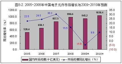 2009年,國內(nèi)電子組件市場需求規(guī)模,同2008年相比將下降4.6%,約為945.2億美元(見圖8-2)。其中,60%左右仍靠進口。