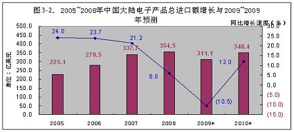 根據(jù)國家海關(guān)總署提供的數(shù)據(jù)分析,今年1~9月份電子產(chǎn)品進口總額為3,017.6億美元,同比下降18.2%,比元月份回升了28.9個百分點。按每月進口額回升幅度的平均值(2.5個百分點)推算,今年總進口額下降速度應回升到-10.5%,達到3,111億美元(見圖3-1)。中國大陸進口的主要電子產(chǎn)品是電子元器件和技術(shù)設備,預計2010年,在電子整機出口回升和國內(nèi)需求增長的驅(qū)動下,總進口額將達到或超過2008年的3,476美元水平(見圖3-2)。
