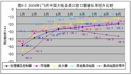 今年1~9月份,中國大陸進口集成電路的降幅不斷回升,從元月份的-46.6%,回升到9月份的-16.9%。共回升了29.7個百分點。按此回升速度,到今年年底可回升到-9.4%(見圖6-1)。