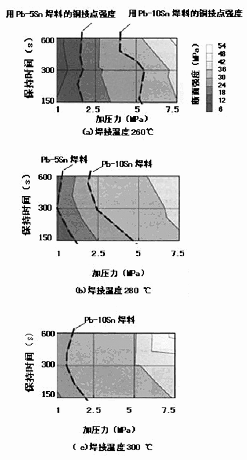 在現(xiàn)行富鉛高溫焊料液相溫度(300℃、315℃)以下的溫度范圍內(nèi)(260℃~300℃),銀納米粒子焊接工藝可以使用。圖10是連接條件與強度的關系。圖中虛線是富鉛焊料Pb-5Sn、 Pb-10Sn與Cu圓板型接頭的斷面強度(分別為18Mpa,30MPa),實線則代表銀納米粒子連接的斷面強度。由圖可知,銀納米粒子不僅有與Pb-5Sn相匹敵的強度,而且可以在低溫、低壓等較寬的連接條件下使用。其次,無論是升溫還是增壓,銀納米粒子連接的斷面強度都是其他兩者無可比擬的。而且,該連接的連接處有高熔點,所以在隨后的2次焊接等熱工藝中不會熔化。另外,就芯片鍵合部所要求的電氣傳導度和熱傳導性而言,由于連接處是由金屬銀形成的,所以一定比現(xiàn)行高溫焊料的特性還要好。
