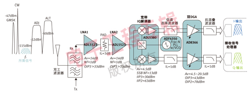 寬帶直接變頻接收機框圖如圖1所示。一些較關鍵的元件規(guī)格在信號鏈中作了高亮顯示。接收機信號路徑從天線端口開始,并連接到雙工器。雙工器經(jīng)常用于頻域雙工(FDD)系統(tǒng),如W-CDMA和某些版本的WiMax。雙工濾波器網(wǎng)絡確保發(fā)射機不會產(chǎn)生過多許可頻帶之外的無用能量,同時有助于抑制無用的帶外信號,避免過度驅動接收機輸入。
