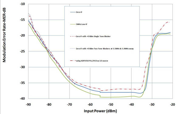 一般來說,一個接收機在接收到的輸入信號功率范圍內(nèi)有三處獨特的MER限制。在大信號電平段,由于接收機中的非線性而落入頻帶內(nèi)的失真分量將導致MER急劇下降。在中等信號電平段,接收機工作于線性方式,信號遠高于任何噪聲電平,此時MER達到最佳值,并受解調(diào)器正交精度、濾波器網(wǎng)絡與可變增益放大器(VGA)以及測試設備精度的支配。隨著信號電平的走低,噪聲的影響越來越顯著,相對于信號電平的MER性能將隨信號電平的下降呈dB-for-dB下降。在更低信號電平,噪聲將成為主要限制因素,以分貝為單位的MER將直接與SNR呈正比關系。
