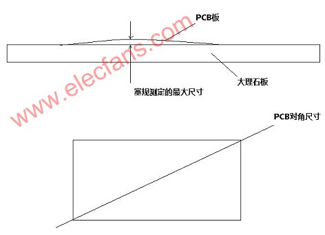 ?! PC標準翹曲度小于0.75%,即為合格產(chǎn)品! 如何測量,首先將PCB板放于大理石平臺 或大于5mm厚的玻璃板上 使用塞規(guī)測量角落最大的尺寸 然后用尺量取PCB對角的長度 兩個數(shù)相除,如果大于千分之七就不合格