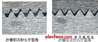 注射頭、料筒硬質合金材料優(yōu)選高耐磨、超細微顆粒的硬質合金,既要考慮硬度也要考慮韌性,如我司開始使用的富士F10材料就因為脆性較大,易出現崩裂問題,壽命不高。后降低硬度改為F20后,注射頭、料筒的使用壽命得到顯著提高;另外需強調注射頭連接內螺紋孔加工的合理性,若采用燒結成型的螺紋,由于牙形角不規(guī)則,牙底尖角應力集中,使用壽命較低,容易出現拉斷現象,因此要求注射頭內螺紋采用電火花加工,牙底尖角圓弧過渡,則改善了注射頭因螺紋孔加工不規(guī)范造成拉傷現象的發(fā)生。