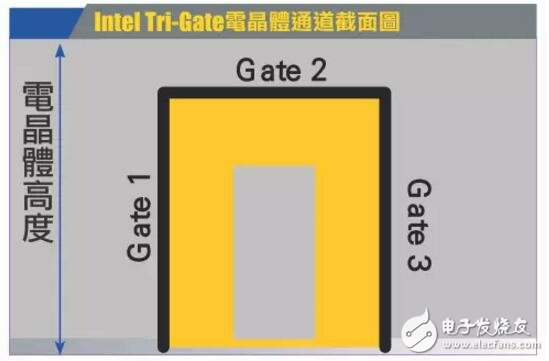 大家一定覺得奇怪,為什么這會通道變成了長相有如電線的東西呢?事實(shí)上它的功能和傳導(dǎo)方式真的和電線一樣呀!基本上它就是電子的走廊。傳統(tǒng)晶體管的通道反正就是薄薄一層,你把它攤平了也只有那一點(diǎn)點(diǎn)可以導(dǎo)電,把它折起來立起來也一樣可以導(dǎo)電。所以我們觀察Fin的剖面圖就可以發(fā)現(xiàn),通道形成原理是一樣的,只是形狀變了,和閘極的相對位置也不一樣了,這有什么好處呢?