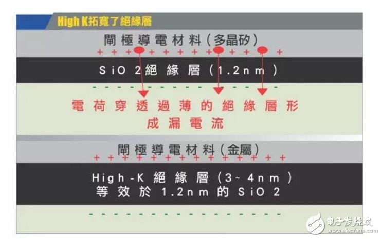 拜高精密的制造機(jī)械所賜,目前的閘極都已經(jīng)薄到不能再薄了,所以目前各公司的走向都會偏向以高K值材料為主,在做到35~40埃的厚度時(埃是一種長度單位,10埃等于1奈米),也有比傳統(tǒng)氧化硅10埃時都更好的容值,而在這個厚度下,閘極漏電流可以有百倍的改善。但是閘極電容一旦變大拉升電壓就會又慢又費(fèi)電,所以現(xiàn)在使用high K材料大多是為了避免閘極電容增加導(dǎo)致絕緣體變厚,以減少漏電。或者是在某些情況下減少閘極寄生電容量。