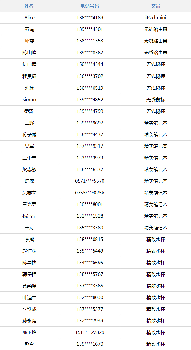 中獎名單:(備注:每個用戶中獎數(shù)量均為一個)