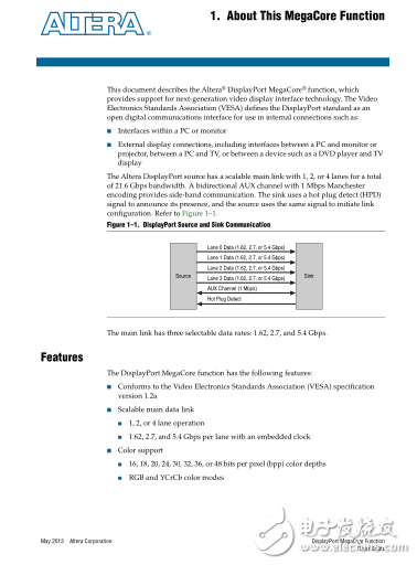 This document describes the Altera ?DisplayPort MegaCore?? function, which provides support for next-generation video display interface technology. The Video Electronics Standards Association (VESA)? defines the DisplayPort standard as an open digital communications interface for? use in internal connections such as: