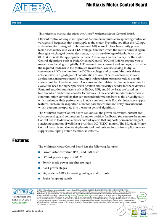 This reference manual describes the Altera? Multiaxis Motor Control Board.The Multiaxis Motor Control Board contains all the power electronics, current and voltage sensing, and connections for motor position feedback. You can use the motor Control Board to develop a motor control system that supports permanent magnet synchronous motors (PMSMs) or brushless DC (BLDC) motors. The Multiaxis Motor Control Board is suitable for single-axis and multiaxis motor control applications and supports multiple position feedback interfaces..