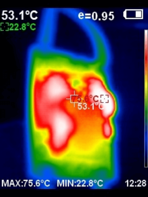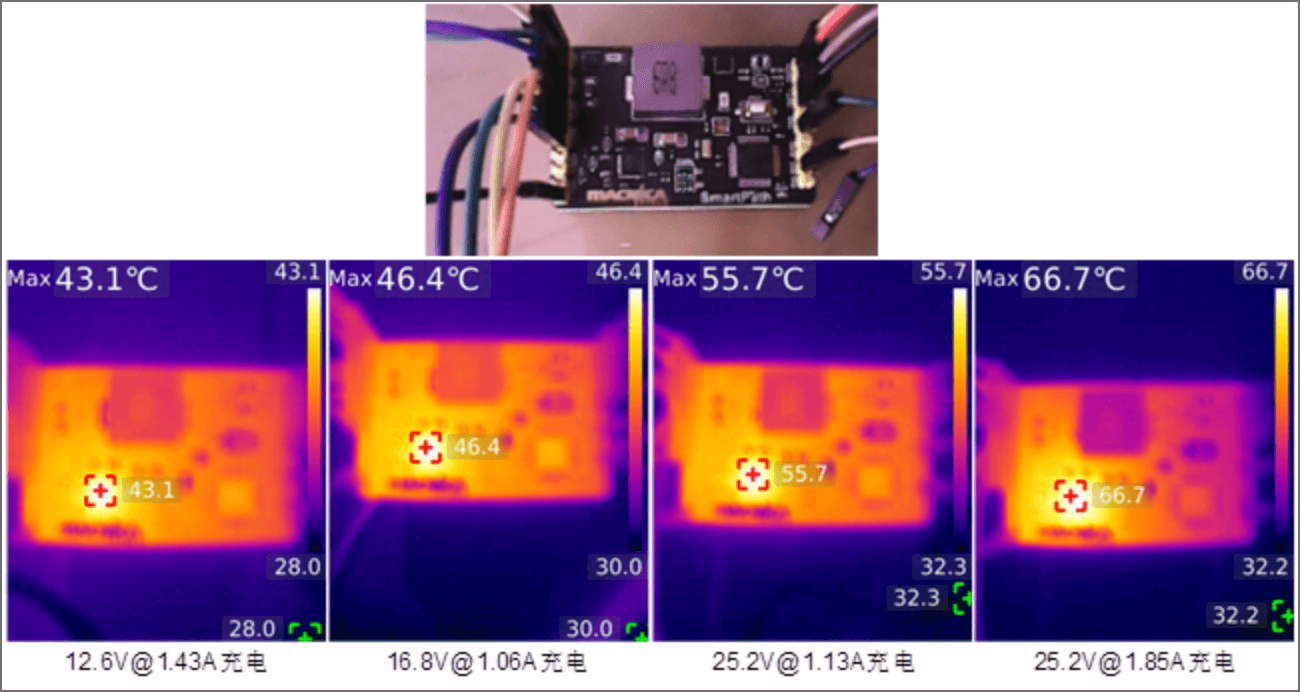 由于模塊具備較高的充電效率,開關電源環(huán)路工作狀態(tài)穩(wěn)定,加之板上采用理想二極管,因此整板熱點基本只有核心功能芯片 LTC4162 本身。如下圖 (圖7) 所示,分別展示了模塊在不同充電條件下,紅外成像的溫度表現。