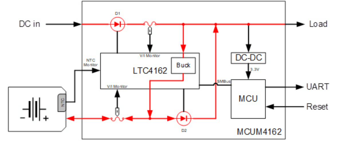 如下圖 (圖1) 所示,它為本次發(fā)布的充放電模塊的技術架構和工作原理,該模塊型號命名為 MCUM4162,它是圍繞 ADI 的高性能電池充放電管理芯片 LTC4162 設計而成的。其中,紅色線段即電池能量的充放電路徑。我們可以看到,路徑上包含了多處理想二極管和電壓電流采樣節(jié)點,這使得模塊能夠實現自動切換末端負載的供電來源,并防止電流倒灌,保護前級部件。