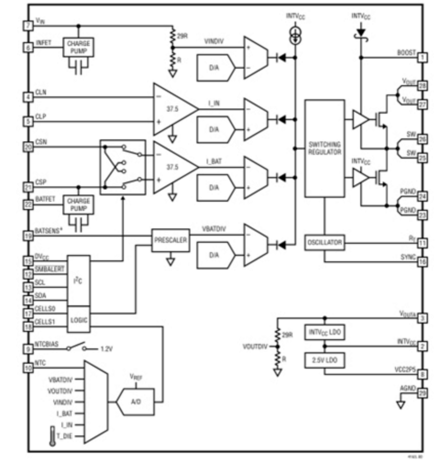 如下圖 (圖2) 所示,它為模塊上的核心功能芯片 LTC4162 的芯片結構圖。由于需要兼容不同電壓、不同種類的電池,該芯片內部有多處 DAC 電路,用于產生各處模擬監(jiān)測與控制電路的基準電壓。板上的理想二極管是基于 NMOS 管形式實現的,LTC4162 內置了理想二極管控制器功能。