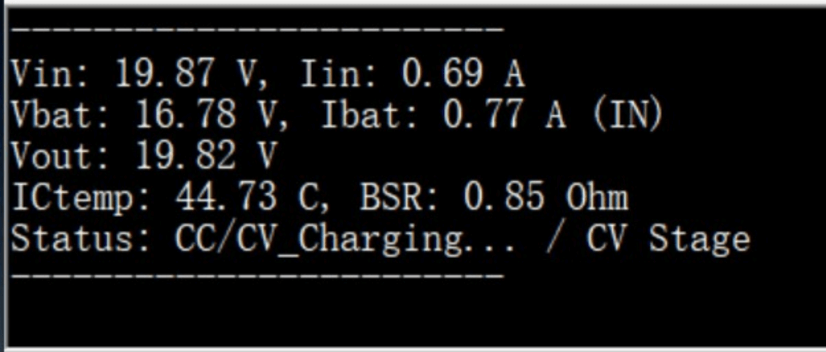 此外,模塊上板載的 MCU,將持續(xù)與 LTC4162 芯片保持 SMBus 總線通信,實時讀取解析芯片內部寄存器的值,并通過 UART 方式以 0.5s 的更新間隔頻率輸出模塊上各關鍵節(jié)點的參數、告警信息,以及芯片工作狀態(tài)等,具體內容將在后文中詳細說明。