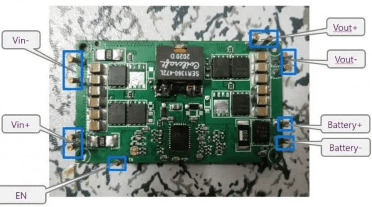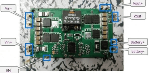只接入DC輸入、電池正負極 (NTC可不接)、輸出負載三個電氣組件,模塊就可以正常工作。若將輸出負載端懸空,模塊也能單獨實現電池的充電功能。對于模塊接入的電池串數,需要通過板上的模式選擇區(qū)域,將電阻焊接到對應位置,進行硬件預配置,在模塊上電時即可自動識別。
