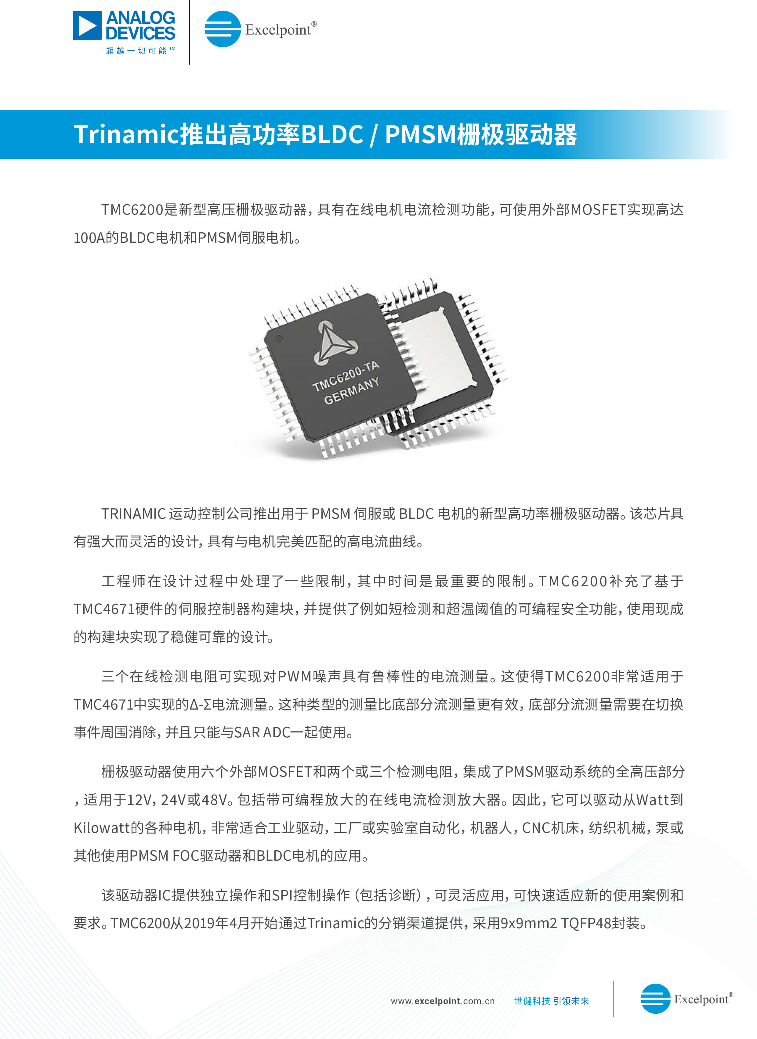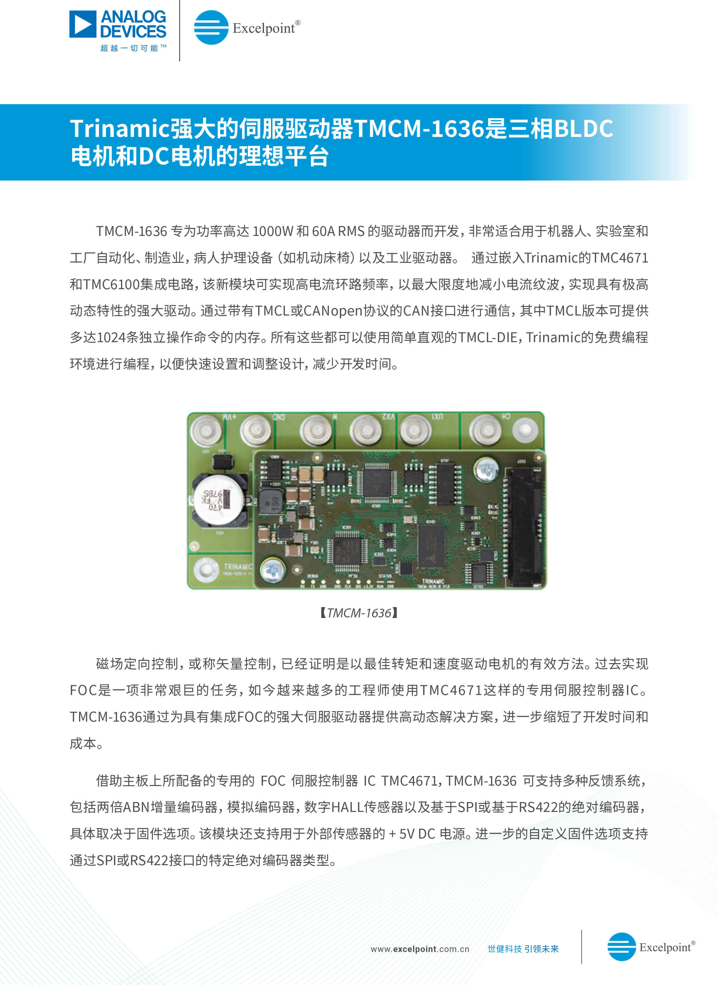 與ADI合作三十多年的技術(shù)型授權(quán)代理商Excelpoint世健,為大家呈現(xiàn)ADI電機(jī)伺服控制與驅(qū)動(dòng)解決方案。ADI在電機(jī)運(yùn)控領(lǐng)域有著深厚的技術(shù)積累,能夠提供應(yīng)對(duì)電機(jī)系統(tǒng)各種設(shè)計(jì)難題的方案。通過(guò)高集成度的設(shè)計(jì),這些高性能運(yùn)控驅(qū)動(dòng)芯片在高速度、高響應(yīng)和高精度上表現(xiàn)十分出色,在電機(jī)領(lǐng)域有著廣泛應(yīng)用,能有效幫助客戶降低精密運(yùn)控的實(shí)現(xiàn)難度。