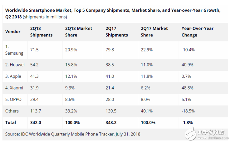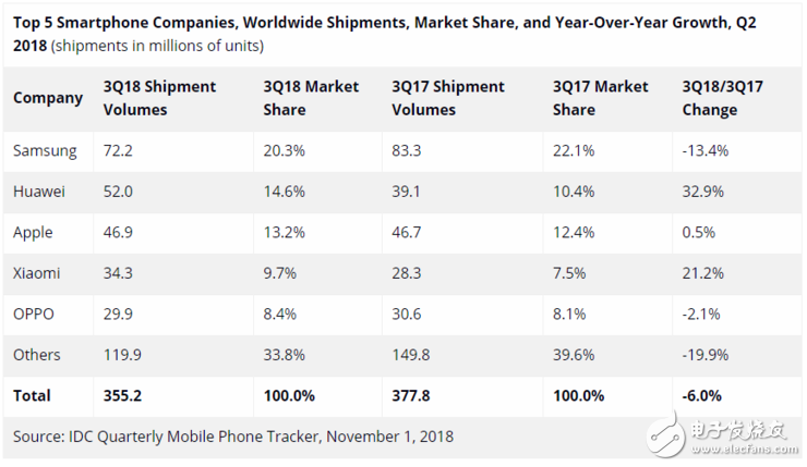 2018 年 11 月 1 日,IDC 發(fā)布了 2018 年第三季度全球智能手機出貨量報告。報告顯示,在全球智能手機銷量下降 6% 的情況下,華為以 4690 萬部的出貨量和 32.9% 的同比增長率,再次獲得全球第二的名次。