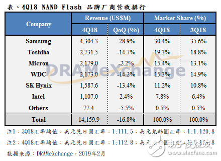 受價格下跌拖累,2018年第四季NAND Flash大廠營收季減16.8%