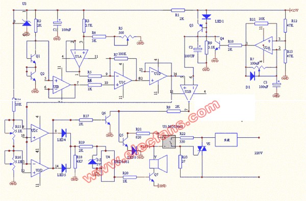 U1A,U1B的接入是為了便于調(diào)試并使差分放大器的輸入阻抗盡可能平衡。Q1、Q2的be結串聯(lián)作為溫度傳感器,由精密穩(wěn)壓集成電路U3(TL431)提供約2.5V的高穩(wěn)定基準電壓源為傳感器及窗口電壓比較器(U2C,U2D)和差分放大器(U1C)提供合適的參考基準輸入。電壓跟巡器U1D起緩沖隔離作用,分別將經(jīng)U1C差分放大器放大后的溫差電壓Vd送到電壓比較器U2B的同相輸入端上,U2C的反相輸入端接在由U2A等組成的鋸齒波電壓發(fā)生器的輸出端上,在鋸齒波電壓低于Vd期間,U2B輸出高電平,Q5飽和導通使接口電路U5得到輸入電流信號,其輸出端觸發(fā)雙向可控硅VS在市電過零時導通。負載得電工作而發(fā)熱。培養(yǎng)箱內(nèi)溫度升高,LED3為一綠色高亮度發(fā)光二極管,其作用有三:1,為抵消因Q6可能出現(xiàn)的飽和壓降過大而使Q5在超溫時不能可靠的截止。因負載得電工作發(fā)熱,培養(yǎng)箱內(nèi)溫度升高,與設定點的溫度差減小,從而引起U1C輸入的差分電壓變小,U1C輸出變小,U1D輸出(Vd)亦變小,(在一個鋸齒波周期內(nèi))U2B輸出高電平時間減少,以致于培養(yǎng)箱內(nèi)溫度上升速度減慢,當培養(yǎng)箱內(nèi)溫度達到設定溫度(37℃)時,此時,溫差最小,Vd此時亦最小,負載得電時間最短。以致于培養(yǎng)箱內(nèi)溫度基本上無變化,負載所發(fā)熱量與培養(yǎng)箱與環(huán)境熱交換所散發(fā)的熱量相當,從而維持培養(yǎng)箱內(nèi)溫度穩(wěn)定在設定溫度上。由于負載工作時間長短與溫差密切相關(溫差大時,Vd大負載得電工作時間就長產(chǎn)熱量多,反之,負載工作時間就少,產(chǎn)熱也少),而且傳感器的輸出經(jīng)約100倍放大從而使得本電路的靈敏度和控制精度都比較高?;旧蠜]有明顯的溫度階躍。U2C,U2D為一窗口電壓比較器,當培養(yǎng)箱內(nèi)溫度低于設定的報警下限溫度時,U2C輸出高電平,黃色發(fā)光二極管LED4被點亮,表示欠溫狀態(tài),同時為報警聲源集成電路U4提供工作電源使U4工作輸出音頻信號經(jīng)Q7放大推動揚聲器發(fā)聲報警;而當某種原因使電路失控而致培養(yǎng)箱內(nèi)溫度升高超過設定報警溫度的上限溫度時,U2D輸出高電平,一路使紅色發(fā)光二極管LED5發(fā)光指示出超溫狀態(tài),并為報警電路供電是揚聲器發(fā)聲報警;與此同時,經(jīng)R17使Q6飽和導通,迫使Q5截止,切斷U5的輸入電流,使VS關斷。負載失電停止工作以防培養(yǎng)箱內(nèi)溫度繼續(xù)升高從而保護了培養(yǎng)箱內(nèi)的培養(yǎng)物的安全。2,作為加熱工作狀態(tài)指示燈用; 3,防止電路可能出現(xiàn)誤動作.