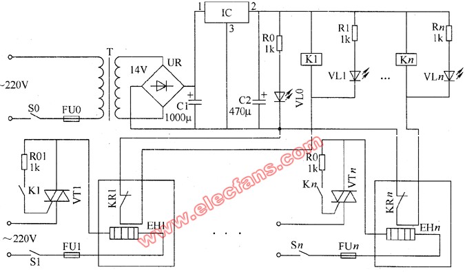 恒溫控制電路曲繼電器K1~Kn、熱繼電器KR1~KRn、電阻器R01~R0n、R1~Rn、晶問管VT1~VTn、熔斷器FU1~FLn、電熱箱電源開關(guān)S1~Sn、電熱器(電熱箱電熱器)EH1~EHn和工作指示發(fā)光二極管VL1~VLn組成。