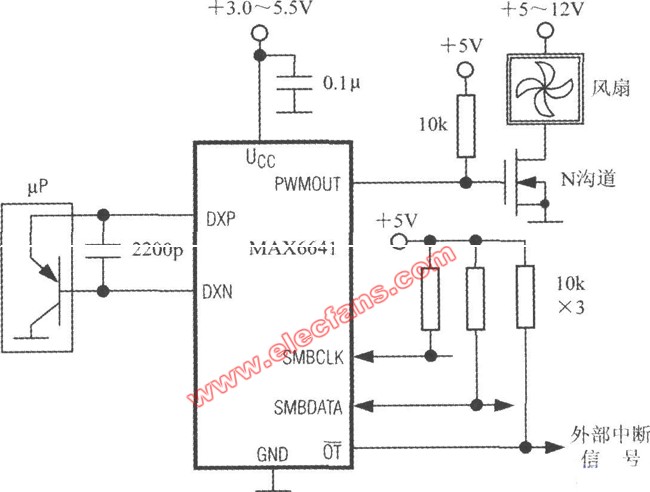智能溫度控制器MAX6641電路圖。這里是用PWMOUT端來驅(qū)動N溝道MOSFET,進而控制風扇轉(zhuǎn)速的。遠程PN結(jié)溫度傳感器可用微處理器(μP)內(nèi)部測溫三極管的發(fā)射結(jié)來代替。亦可選CMPT3906、T3906、KST3906-TF、SMBT3906等型號的分立元件三極管。要求三極管發(fā)射結(jié)的正向壓降必須在最高預(yù)期溫度和10μA電流下大于0.25V; 在最低預(yù)期溫度和100μA電流下小于0.95V。不得使用大功率三極管。