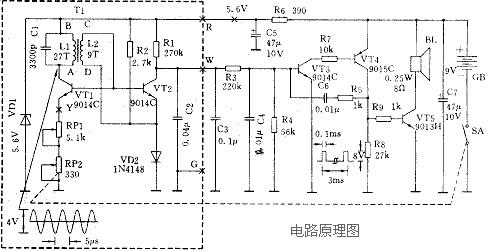 由三極管VT1和高頻變壓器T1等組成,是一種變壓器反饋型LC振蕩器。T1的初級(jí)線圈L1和電容器C1組成LC并聯(lián)振蕩回路,其振蕩頻率約200kHz,由L1的電感量和C1的電容量決定。T1的次級(jí)線圈L2作為振蕩器的反饋線圈,其“C”端接振蕩管VT1的基極,“D”端接VD2。由于VD2處于正向?qū)顟B(tài),對(duì)高頻信號(hào)來說,“D”端可視為接地。在高頻變壓器T1中,如果“A” 和“D”端分別為初、次級(jí)線圈繞線方向的首端,則從“C”端輸入到振蕩管VT1基極的反饋信號(hào),能夠使電路形成正反饋而產(chǎn)生自激高頻振蕩。振蕩器反饋電壓的大小與線圈L1、L2的匝數(shù)比有關(guān),匝數(shù)比過小,由于反饋太弱,不容易起振,過大引起振蕩波形失真,還會(huì)使金屬探測(cè)器靈敏度大為降低。振蕩管VT1的偏置電路由R2和二極管VD2組成,R2為VD2的限流電阻。由于二極管正向閾值電壓恒定(約0.7V),通過次級(jí)線圈L2加到VT1的基極,以得到穩(wěn)定的偏置電壓。顯然,這種穩(wěn)壓式的偏置電路能夠大大增強(qiáng)VT1高頻振蕩器的穩(wěn)定性。為了進(jìn)一步提高金屬探測(cè)器的可靠性和靈敏度,高頻振蕩器通過穩(wěn)壓電路供電,其電路由穩(wěn)壓二極管VD1、限流電阻器R6和去耦電容器C5組成。振蕩管VT1發(fā)射極與地之間接有兩個(gè)串聯(lián)的電位器,具有發(fā)射極電流負(fù)反饋?zhàn)饔?,其電阻值越大,?fù)反饋?zhàn)饔迷綇?qiáng),VT1的放大能力也就越低,甚至于使電路停振。RP1為振蕩器增益的粗調(diào)電位器,RP2為細(xì)調(diào)電位器。