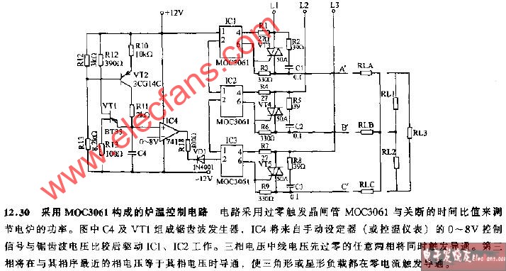 的電之間在電氣上完全隔離,且可以直接可靠地觸發(fā)50A或更大的功率的晶閘管。 圖5 圖5是一個采用MOC3061過零觸發(fā)晶閘管構(gòu)成的爐溫控制系統(tǒng)。一般調(diào)節(jié)