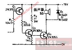 這一例防盜報警器采用高音揚聲器發(fā)聲,音響輸出功率可達(dá)20W.觸發(fā)方式為斷線觸發(fā)式,即連線一斷,電路立即報警.
