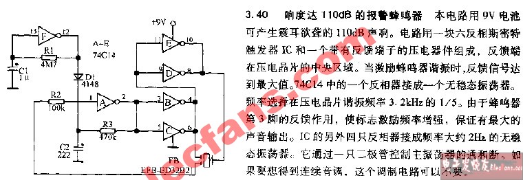 該蜂鳴器電路將從110V產(chǎn)生9dB的汽車分割。該裝置使用單個74C14(CD40106B)CMOS六角反相施密特觸發(fā)器IC,必須與帶有反饋端子的壓電器件一起使用。反饋端子連接到壓電晶圓