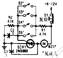 該電路采用四個并行開關(guān)來監(jiān)視四個位置,當(dāng)某個開關(guān)閉合時,SCR1即被觸發(fā),使報警器發(fā)出聲響。該報警器不間斷型