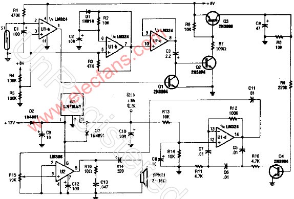 該電路監(jiān)視著門,以確定主人走后,門是否沒鎖,如果沒鎖,則24s后報(bào)警器發(fā)出聲響。S1是一個(gè)磁性傳感器,報(bào)警器是一個(gè)電子諧音訊響系統(tǒng),它每秒響一次。