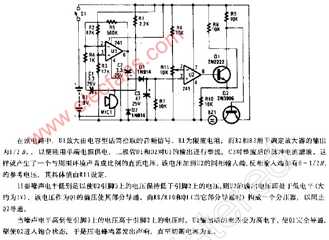 圖中晶體管VT4和VT5組成了電子開關(guān)和音頻振蕩器,起受潮報(bào)警的作用。VT5和變壓器組成了反饋式音頻振蕩器,振蕩頻率由變壓器電感L和電容C2決定,改變電阻R9值可改變反饋量大小,使聲音悅耳。VT4