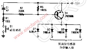按下開關(guān)S1,C1充電到電源電壓,Q1經(jīng)由電阻R2和R3得到正偏置而導(dǎo)通,在延遲周期時(shí)間內(nèi)提供一個(gè)電壓,使報(bào)警電路斷開,C1的容量可以增大或減小以改變延遲時(shí)間。