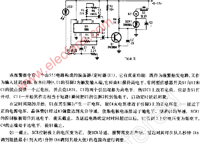 555防盜門報警器:這是一種手觸式延時報警器,可用作門鎖防盜報警器,當(dāng)人體通過鑰匙與鎖接觸時間稍長時就會發(fā)出報警聲,而正常的開鎖時間不會