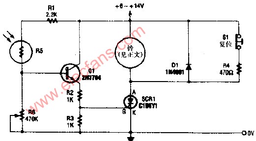 帶鎖閉電路的光激發(fā)報警器 在該電路中.光敏電阻R5在光的作用下使Q1正向偏置,R6用于調整靈敏度,SCR1由Q1發(fā)射極上的電壓觸發(fā),激發(fā)警鈴發(fā)出聲響,S1被按下以后SCR1開鎖.要確保用自中斷警鈴(機電式蜂鳴器或鈴) 聲明:本文內容及配圖由入駐作者撰寫或者入駐合作網站授權轉載。文章觀點僅代表作者本人,不代表電子發(fā)燒友網立場。文章及其配圖僅供工程師學習之用,如有內容侵權或者其他違規(guī)問題,請聯(lián)系本站處理。 舉報投訴 收藏 人收藏 掃一掃,分享給好友 復制鏈接分享 加入交流群 掃碼添加小助手 加入工程師交流群 評論 發(fā)布評論請先 登錄 相關推薦 熱點推薦 光檢測報警器電路圖 光檢測報警器電路圖:是一個簡單的光檢測報警器電路。當光線投射到CDS光敏電阻上時,其阻值減小,使 發(fā)表于 12-19 19:00 ?1516次閱讀 光控語音防盜報警器電路圖 光控語音防盜報警器電路圖 發(fā)表于 11-06 11:19 ?1363次閱讀 自鎖報警器電路 自鎖報警器電路 發(fā)表于 01-11 22:51 ?684次閱讀 自鎖式報警器電路 自鎖式報警器電路 發(fā)表于 01-11 22:52 ?621次閱讀 閂鎖防盜報警器電路圖 閂鎖防盜報警器電路圖 發(fā)表于 03-19 10:25 ?845次閱讀 閂鎖防盜報警器圖 閂鎖防盜報警器電路圖 發(fā)表于 03-19 10:26 ?497次閱讀 報警鈴輸出改進型光觸發(fā)報警2電路圖 報警鈴輸出改進型光觸發(fā)報警2電路圖 發(fā)表于 06-10 09:10 ?2162次閱讀 報警鈴輸出改進型光觸發(fā)報警電路圖 報警鈴輸出改進型光觸發(fā)報警電路圖 發(fā)表于 06-10 09:10 ?2285次閱讀 簡單的報警鈴輸出光觸發(fā)報警電路圖 簡單的報警鈴輸出光觸發(fā)報警電路圖 發(fā)表于 06-10 09:19 ?3480次閱讀 線鎖式報警器電路 線鎖式報警器電路 發(fā)表于 07-19 19:10 ?2152次閱讀 精密光激發(fā)報警電路 精密光激發(fā)報警電路 光敏CDS電池R8接在由IC1構 發(fā)表于 09-04 16:52 ?1877次閱讀 帶斷續(xù)音頻輸出的暗激發(fā)報警電路 帶斷續(xù)音頻輸出的暗激發(fā)報警電路 或非門a和a構成低頻 發(fā)表于 09-04 17:24 ?2853次閱讀 光束激發(fā)報警器的前置放大器 光束激發(fā)報警器的前置放大器 該電路適用于光束重復頻率大20Hz的情況。 發(fā)表于 09-04 17:34 ?2328次閱讀 帶滯后作用的光激發(fā)精密報警器 帶滯后作用的光激發(fā)精密報警器 TL081用作惠斯登 發(fā)表于 09-04 17:47 ?2165次閱讀 自鎖式光激發(fā)音頻輸出報警電路 自鎖式光激發(fā)音頻輸出報警電路 當光線照射到CDS光電池時,其電阻下降, 發(fā)表于 09-05 10:36 ?2149次閱讀