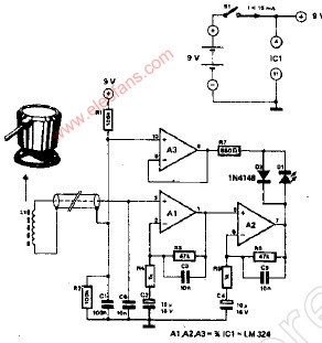 該電路適用拾音線圈來檢測帶有交流電導(dǎo)線周圍50-60Hz的電場,L1是一個(gè)帶有抽氣基座的電話拾音線,指示燈D1(LED)在正辦波亮,表示線路中有交流電源。
