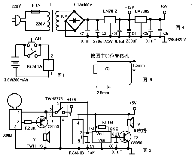 智能電子防盜門電路工作原理:家人使用鑰匙開鎖時(shí),只需幾秒鐘就可以將門打開,而竊賊行竊時(shí) 不管是橇門還是用鑰匙試開都需要較長時(shí)間,所以根據(jù)開鎖時(shí)間可以判斷來人的身份。 ND-2模塊是天津特新電子廠生產(chǎn)的新一代振動(dòng)報(bào)警傳感器,采用最先進(jìn)的固 態(tài)加速度檢測(cè)器件,既對(duì)振動(dòng)有很高的檢測(cè)靈敏度,又對(duì)周圍環(huán)境中的聲音信號(hào)有很強(qiáng)的抑制作用,不容易誤報(bào),振動(dòng)檢測(cè)準(zhǔn)確可靠。ND-2模塊的另一大特點(diǎn)是靜態(tài)功耗極微,靜態(tài)電流小于1uA,是目前振動(dòng)檢測(cè)傳感器耗能最小的器件,特別適用于用電池供電的報(bào)警器。 ND-2模塊的輸出方式采用集電極開路輸出當(dāng)檢測(cè)到振動(dòng)時(shí),內(nèi)部的三極管導(dǎo) 通5秒,輸出端輸出下拉電平,通過R1使Q1導(dǎo)通A點(diǎn)獲得正電源。LED點(diǎn)亮并且CMOS型時(shí)基電路7555加電進(jìn)入延時(shí),延時(shí)時(shí)間T=1.1R3C1,按圖中R3C1的值延時(shí)約10秒,如果在10秒內(nèi)持續(xù)檢測(cè)到振動(dòng)信號(hào)時(shí),時(shí)基電路的第3腳立即輸出高電平,觸發(fā)抓賊語言片工作,調(diào)節(jié)R4C2的值可改變報(bào)警聲音的語調(diào)和語速,語言信號(hào)經(jīng)Q2放大后推動(dòng)揚(yáng)聲器發(fā)出響亮的語言報(bào)警聲。ND-2和語言芯片SR8803A的最高電壓為5V,所以串入D1、D2后可使電源電壓適當(dāng)降低。 K是鎖控開關(guān)是制作的關(guān)鍵,鐵門上的防盜鎖和一般的鎖具有些區(qū)別,它的正 反兩面都能用鑰匙反鎖,鎖具背面不是緊貼在鐵門上的,正好有空間加裝小開關(guān),開關(guān)可以采用一種帶杠桿的微動(dòng)開關(guān),將鎖具背面的蓋板卸下,照?qǐng)D1的尺寸鉆一個(gè)6mm的孔。在沒有保險(xiǎn)時(shí),長方形的保險(xiǎn)鎖舌全部縮在鎖具內(nèi),鎖舌的肩部正好將孔遮住一半,保險(xiǎn)時(shí)鎖舌伸出,孔內(nèi)沒用遮擋物。在杠桿上接上一段鐵絲,伸入孔中,使得沒有保險(xiǎn)時(shí),鎖舌的肩部壓住杠桿使K斷開,保險(xiǎn)時(shí)釋放杠桿使K接通。 LED安裝在門鎖鎖孔的正上方,只要鑰匙碰觸到鎖孔,ND-2受到振動(dòng),紅色 的LED就會(huì)發(fā)光,提供開鎖時(shí)的微光照明,同時(shí)給欲圖謀不軌者一個(gè)警告,有一定的威懾作用。ND-2振動(dòng)檢測(cè)模塊可用粘結(jié)劑粘在門鎖的反面,并與報(bào)警揚(yáng)聲器之間做好隔振措施,防止振動(dòng)反饋引起報(bào)警不停。