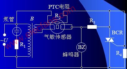 右圖為正溫度系數(shù)熱敏電阻(R2)的延時(shí)電路。剛通電時(shí),其電阻值也小,電流大部分經(jīng)熱敏電阻回到變壓器,蜂鳴器(BZ)不發(fā)出報(bào)警。當(dāng)通電1~2min后,阻值急劇增大,通過(guò)蜂鳴器的電流增大,電路進(jìn)入正常的工作狀態(tài)。
