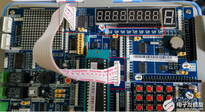 在開發(fā)板上,需要使用排線將J12排針與P0口相連接。