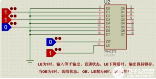 LE則是輸出端狀態(tài)改變使能端,當(dāng)LE為低電平,輸出端Q始終保持上一次存儲的信號(從D端輸入),當(dāng)LE為高電平時,Q緊隨D的狀態(tài)變化,并將D的狀態(tài)鎖存。也就是說當(dāng)鎖存使能端LE為高時,這些器件的鎖存對于數(shù)據(jù)是透明的(也就是說輸出同步)。當(dāng)鎖存使能變低時,符合建立時間和保持時間的數(shù)據(jù)會被鎖存。