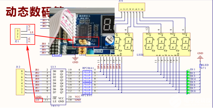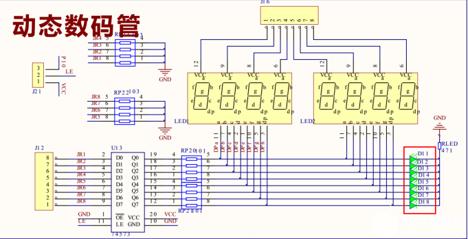 LED燈模塊是通過74573鎖存器芯片與單片機(jī)IO口連接,并與數(shù)碼管共用IO口。