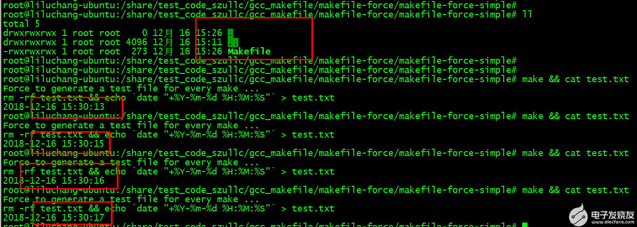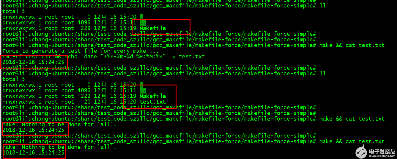 執(zhí)行輸出如下所示: 我們可以看到,這達(dá)到了我們的目的,每次test.txt都是重新生成了,它記錄了每次make的時(shí)間。