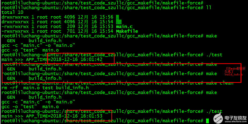 從輸出的測(cè)試,我們可以看出,make的每次執(zhí)行都觸發(fā)了生成build_info.h,但是運(yùn)行編譯出來的test可執(zhí)行程序,我們發(fā)現(xiàn)并不是每次生成的build_info.h的內(nèi)容都傳遞到了test里面;也就是當(dāng)build_info.h改變的時(shí)候,test沒有被重新編譯。這里先留下點(diǎn)疑問,為何會(huì)產(chǎn)生這樣的問題。博主將會(huì)在后續(xù)的文章中解決這個(gè)問題。