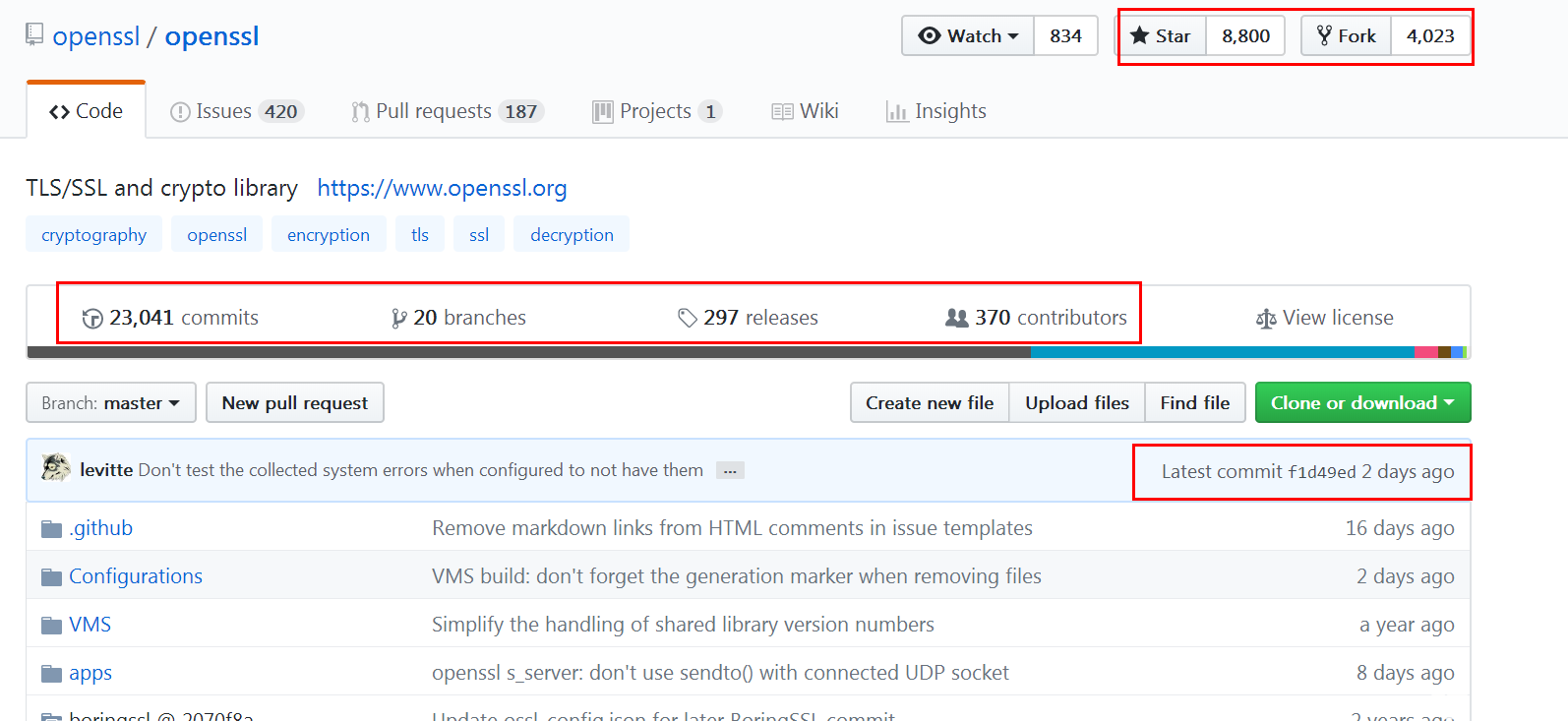 熟悉github的朋友,一定在github上目睹過openssl的真容【https://github.com/openssl/openssl】,它的官網(wǎng)地址是【/index.html】。就拿github來說,高達8.8K顆星,被fork4千多次,總共有2萬多次的提交記錄,足以可見該開源項目的熱度有多高。