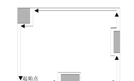 由于掃地器人采用的是紅外線傳感器,考慮到紅外線的探測(cè)范圍和清掃環(huán)境的未知性,采用了一種沿邊學(xué)習(xí)的方式,即讓清潔機(jī)器人從指定位置沿墻壁及其靠近墻壁的障礙物外緣按逆時(shí)針(或順時(shí)針)方向繞房行走一周,行走過程中實(shí)時(shí)記錄清潔機(jī)器人中心點(diǎn)的位置坐標(biāo),這樣就可以大致描述出清掃環(huán)境的輪廓及靠墻障礙物的分布情況。并記錄下當(dāng)y坐標(biāo)達(dá)到最大值ymax時(shí),x能達(dá)到的最大值xmax(考慮到障礙物可能存在于墻壁的右下角)。
